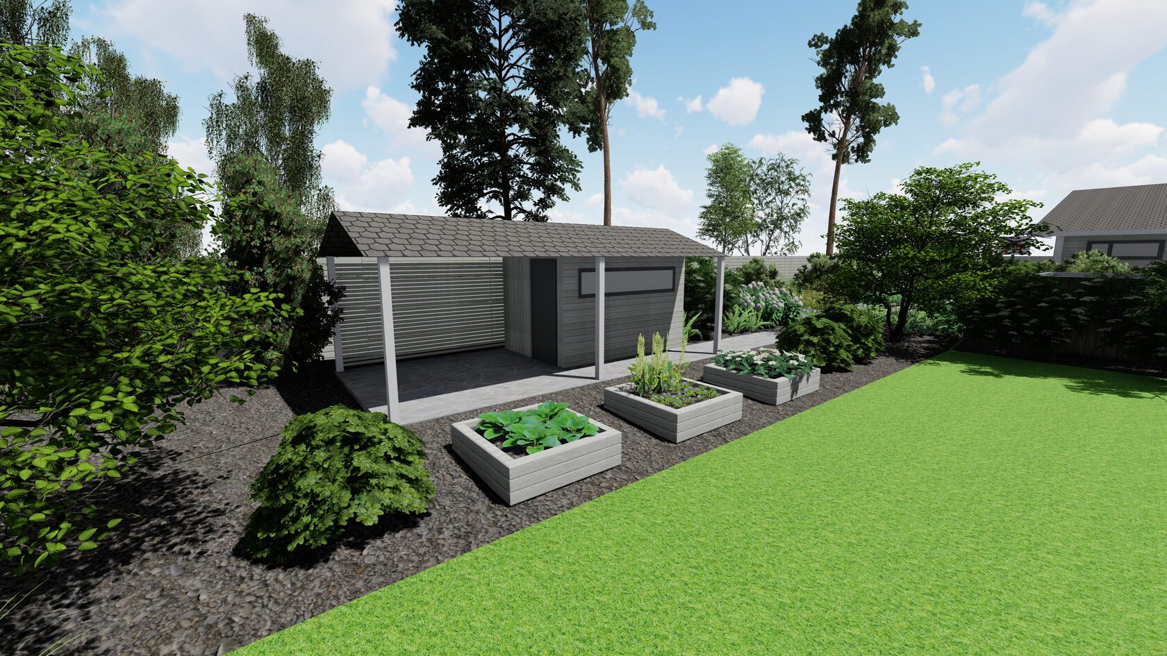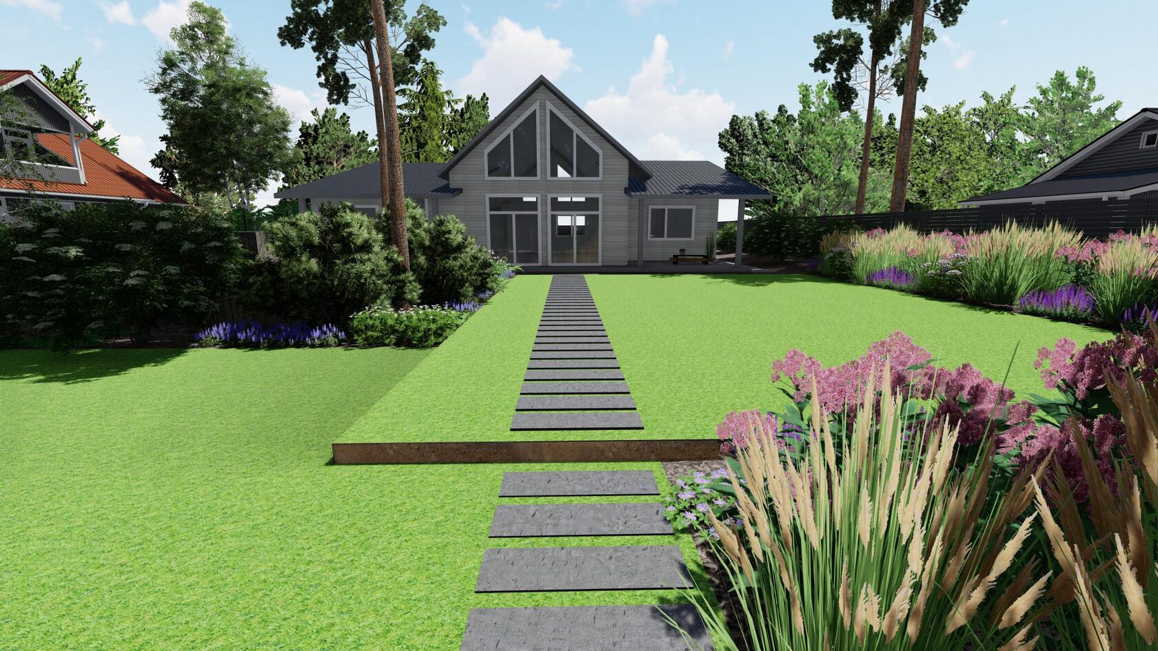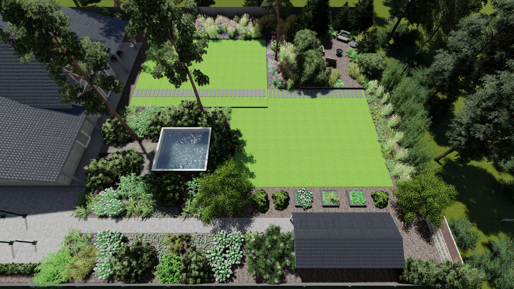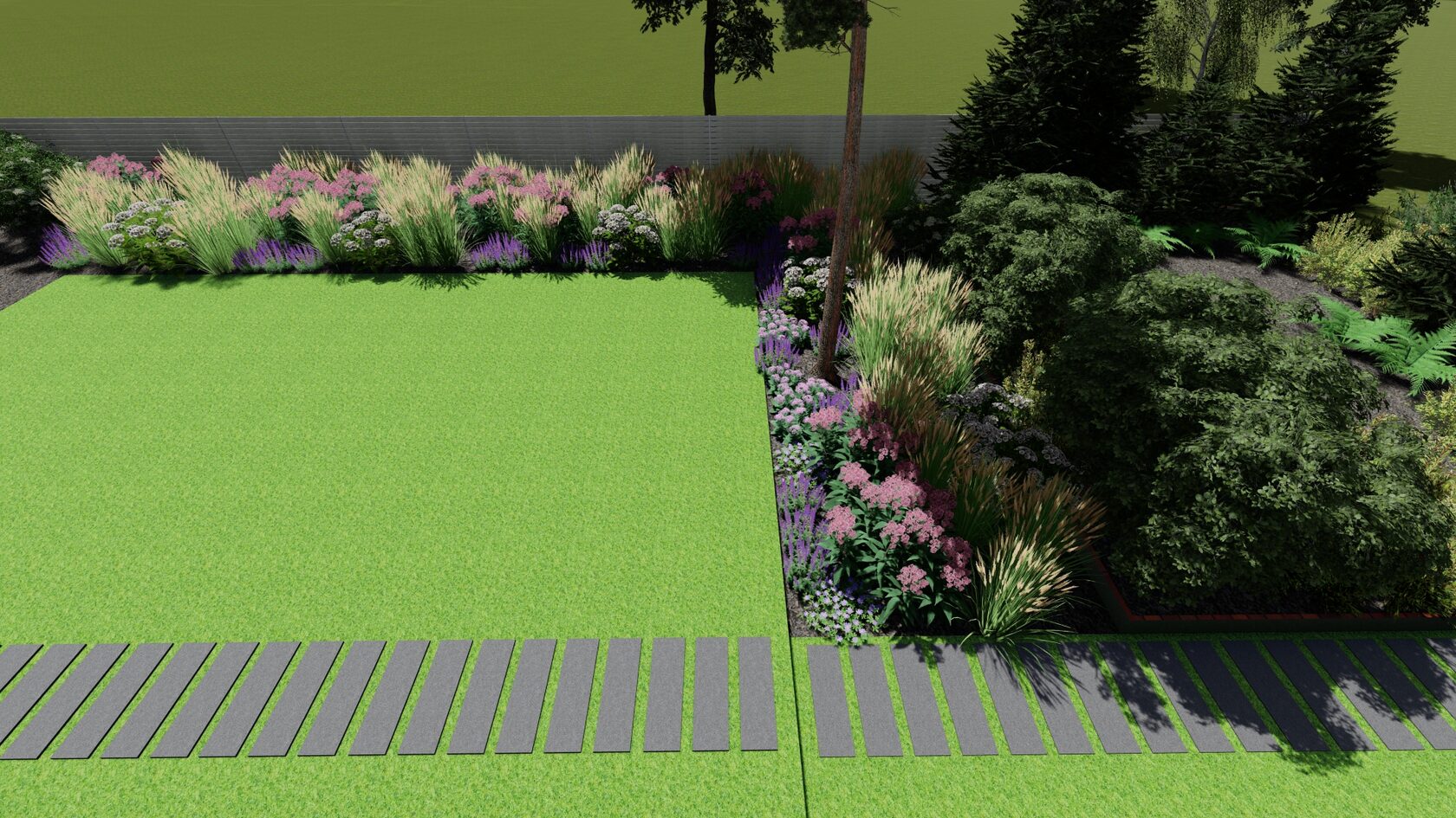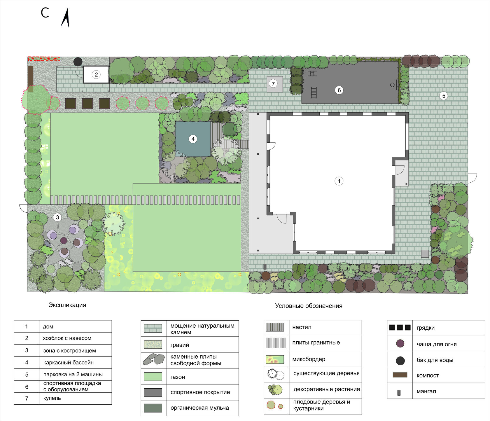 При помощи уровней рельефа и яркости цветения подчеркивается иерархия частей сада. Например, есть главный газон, он ближе всего к дому, обрамлен яркими, разноцветными посадками с двух сторон. А есть второй, удаленный газон, соседствующий с хозяйственной постройкой и огородом. Он ниже на ступень, у него всего один цветник, выдержанный в более спокойной белой гамме.