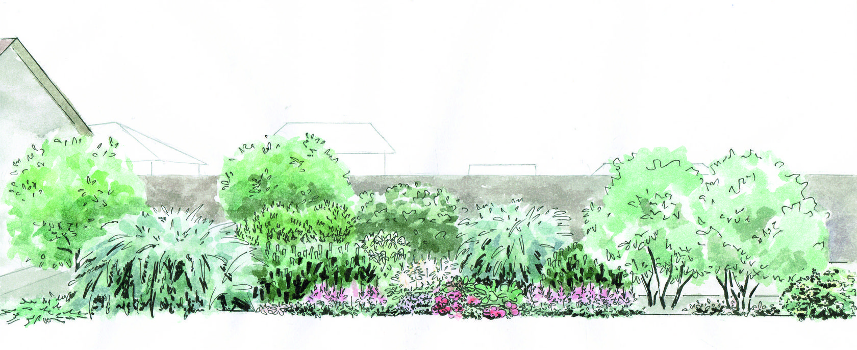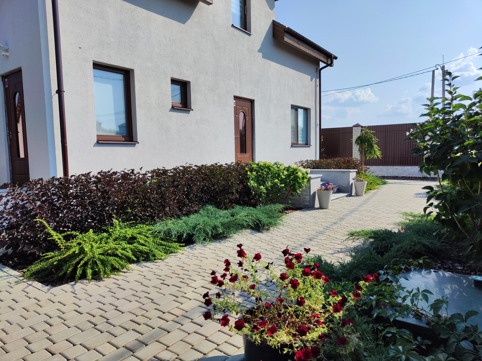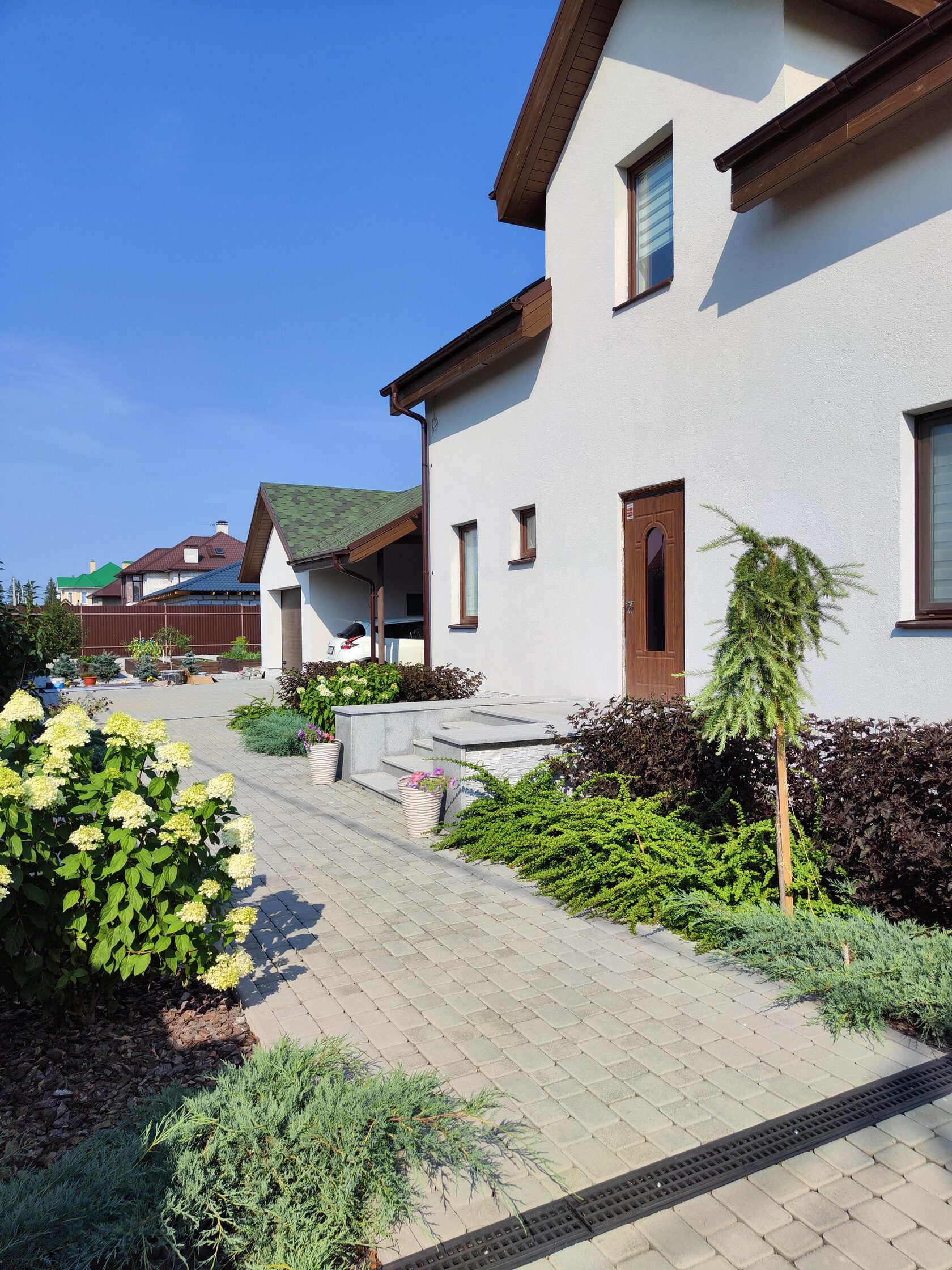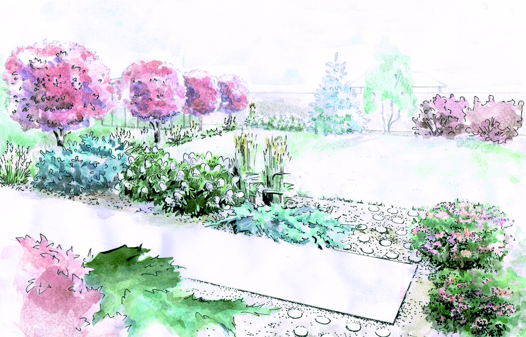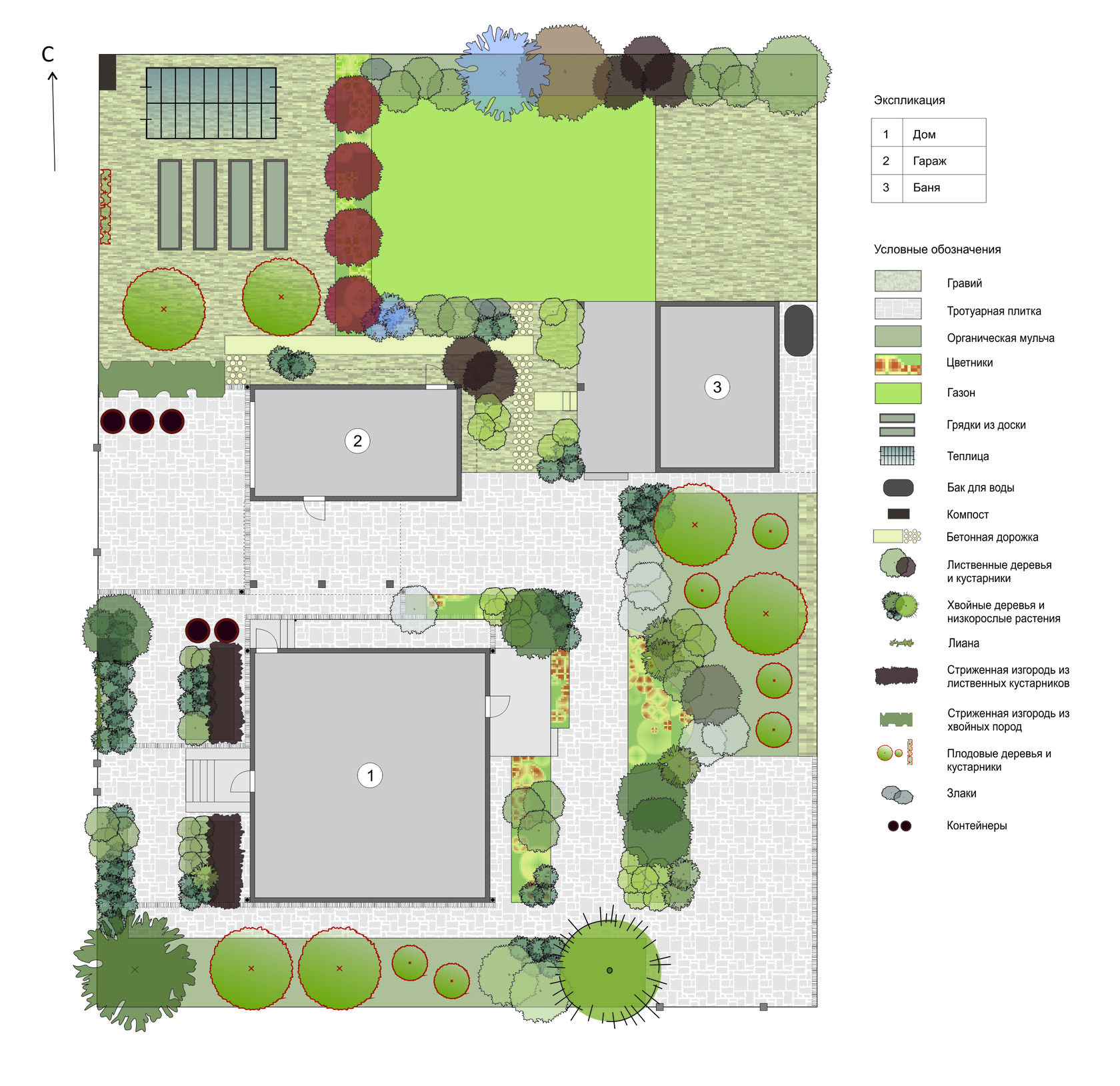 Иногда идею сада задают уже имеющиеся на участке постройки. Здесь: дом, гараж, баня с верандой - "поделили" участок на части. Мы же решили еще немного усложнить это деление - добавили рядовую посадку декоративных краснолистных яблонь. Тем самым, отделили декоративную зону с газоном от огородной части. Высокими посадками прикрыли хозяйственный въезд.