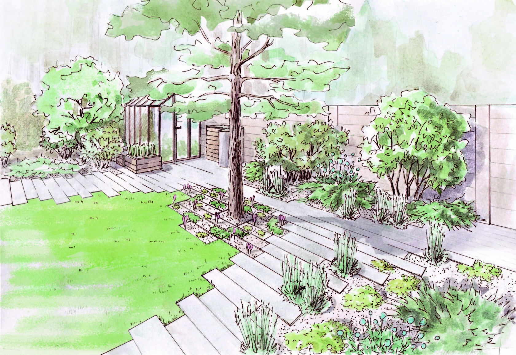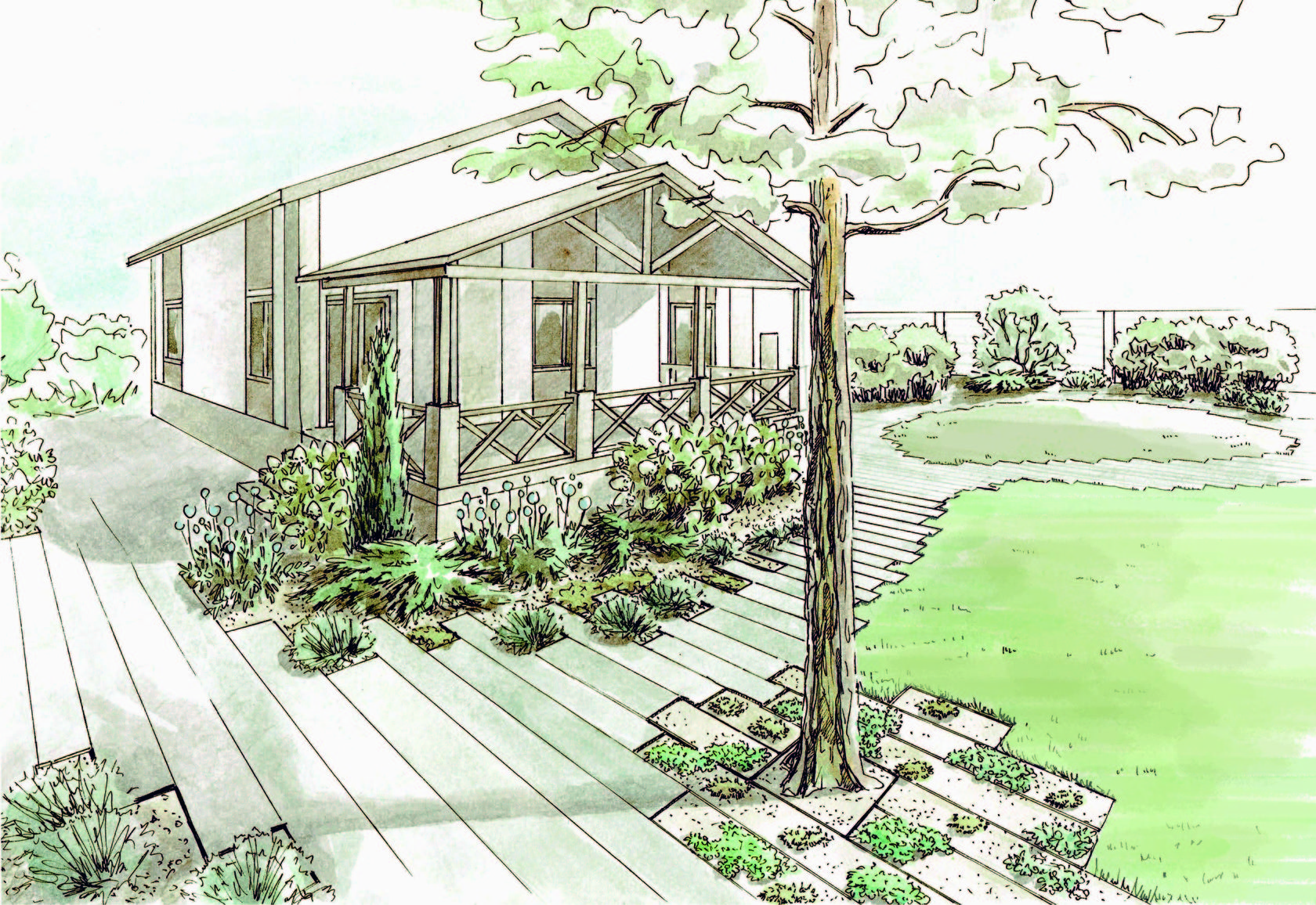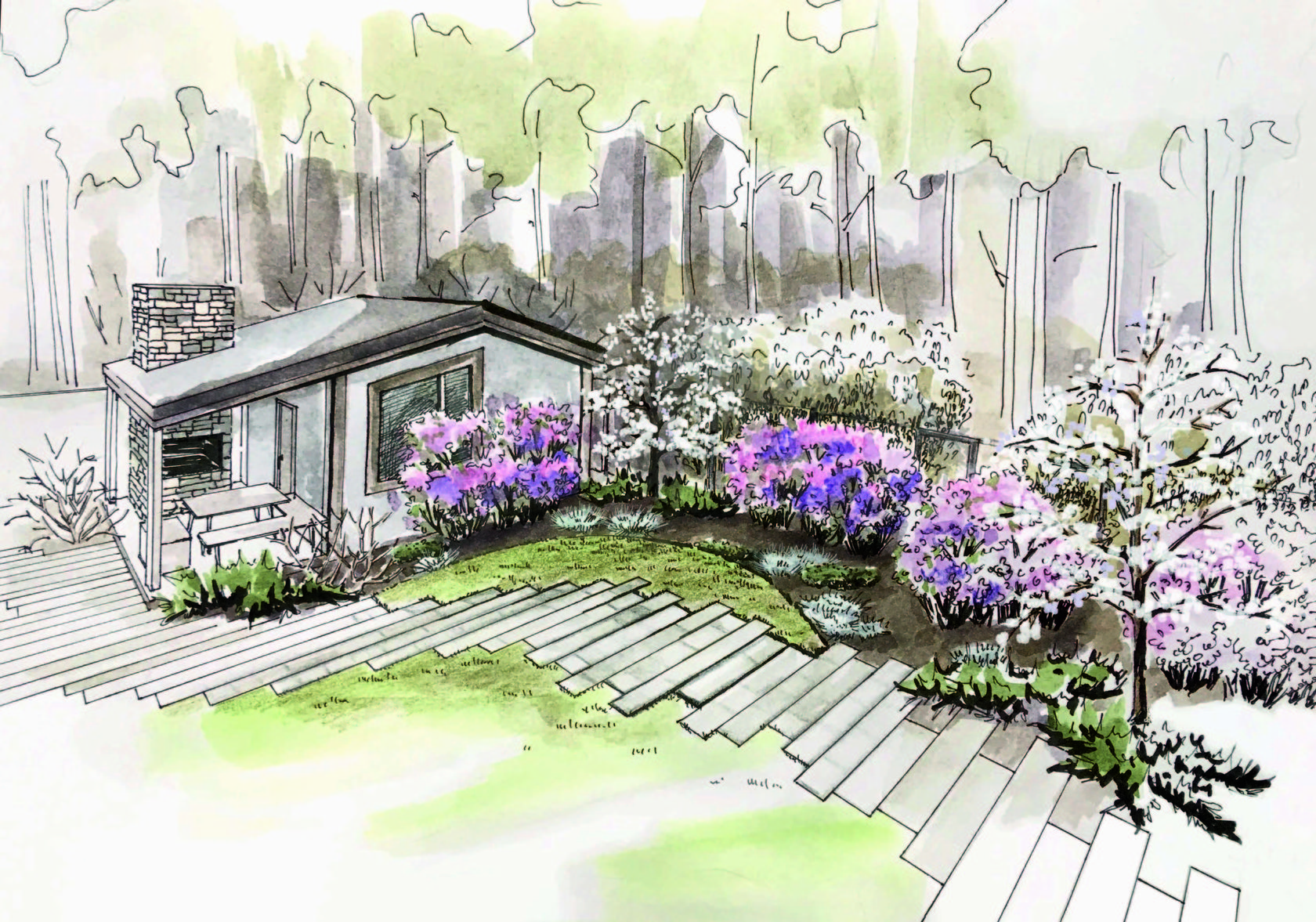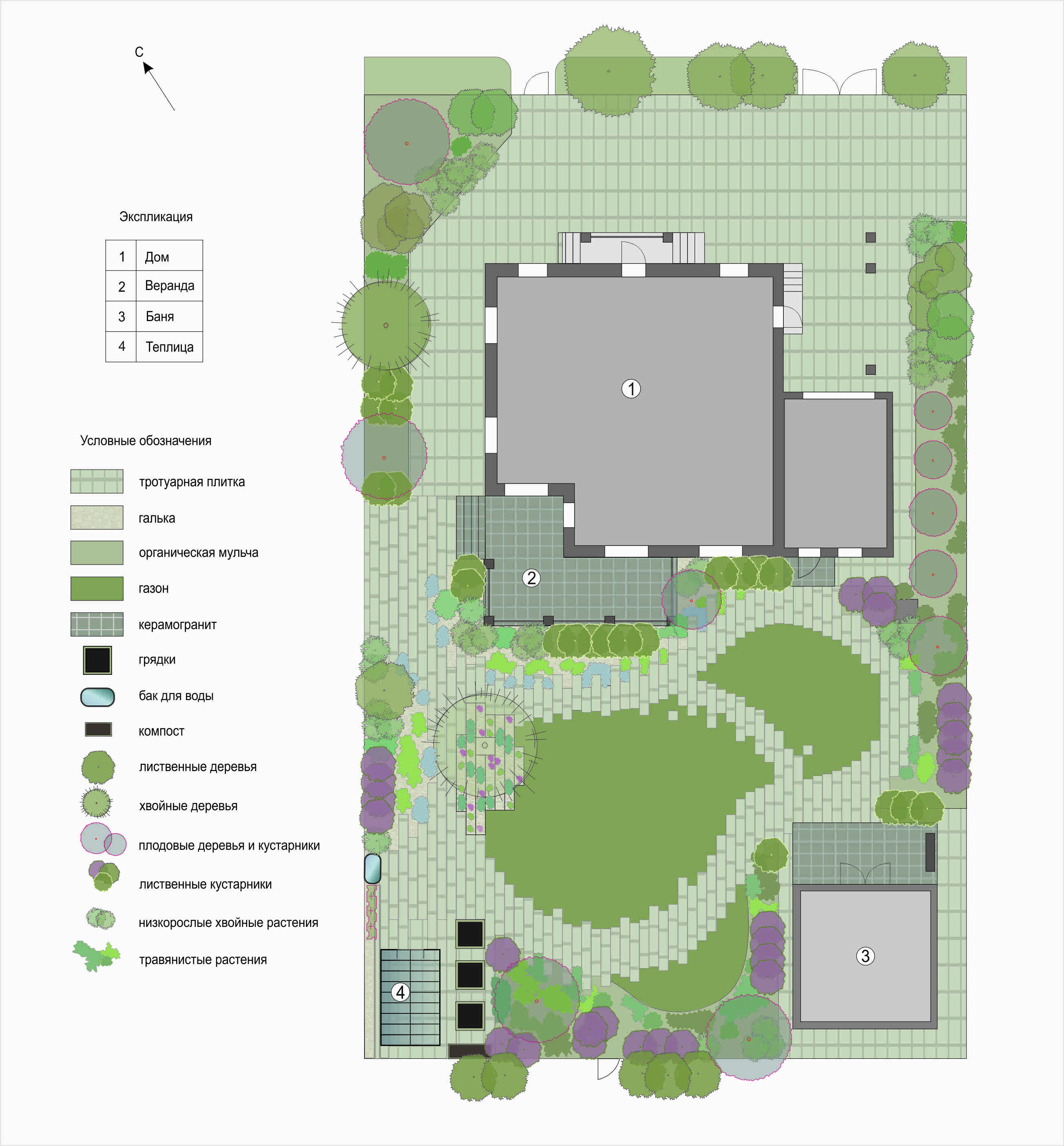 В воображении всплыли леса с массовыми зарослями рододендрона даурского, который, кстати, считается растением-символом забайкальского края. На нашу удачу, заказчики тоже очень хотели рододендрон. Итак, планировка представляет из себя поляну на краю леса, обрамленную мощением, проникающим в нее и в окружающие ее группы растений.